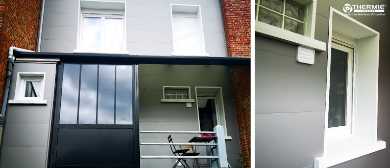 Avec une pose des lames à l’horizontal, les lignes discrètes donnent un style moderne et épuré à la façade arrière. Le contraste des finitions aluminium gris avec les menuiseries blanches et noires est du plus bel effet. La faible épaisseur des panneaux isolants a permis à Valérie de ne pas perdre de surface habitable puisque le revêtement est placé à l’extérieur et non à l’intérieur. Notre cliente est séduite !