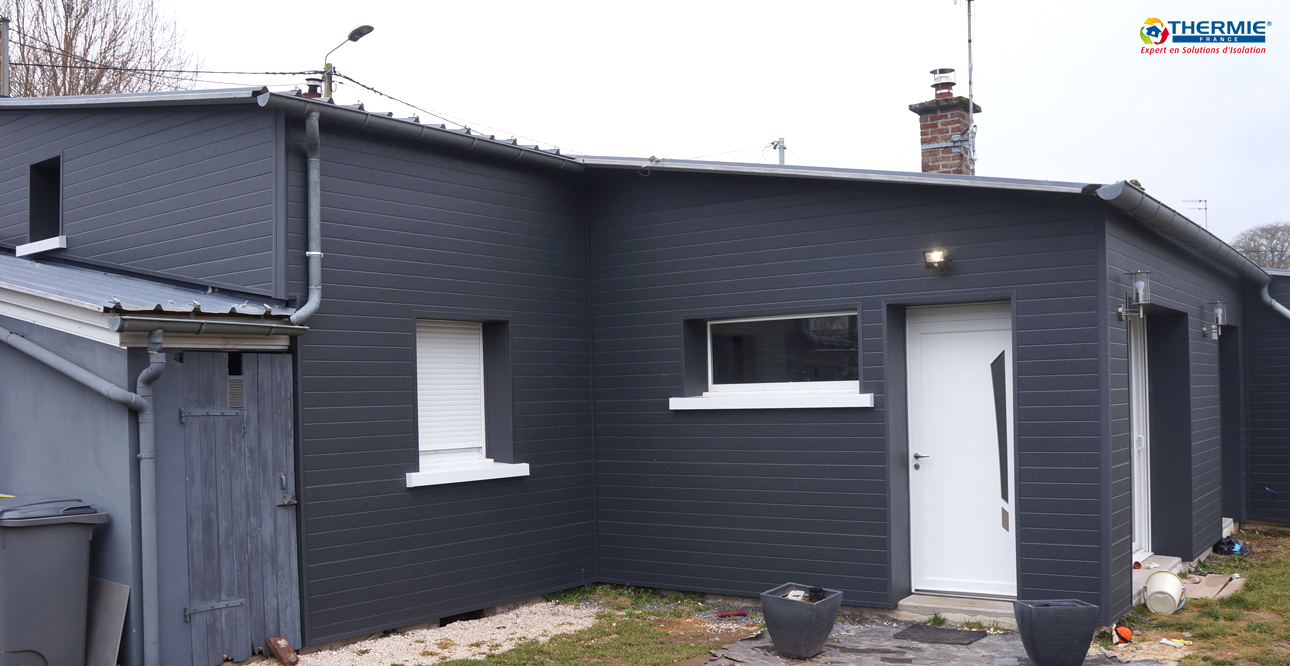 Les clients ont fait le choix d’un bardage clin anthracite pour recouvrir leurs façades arrières. Les lignes sobres donnent à l’habitation une allure plus moderne. Le coloris sombre renforce le style épuré de la maison et le contraste avec les menuiseries blanches est du plus bel effet.