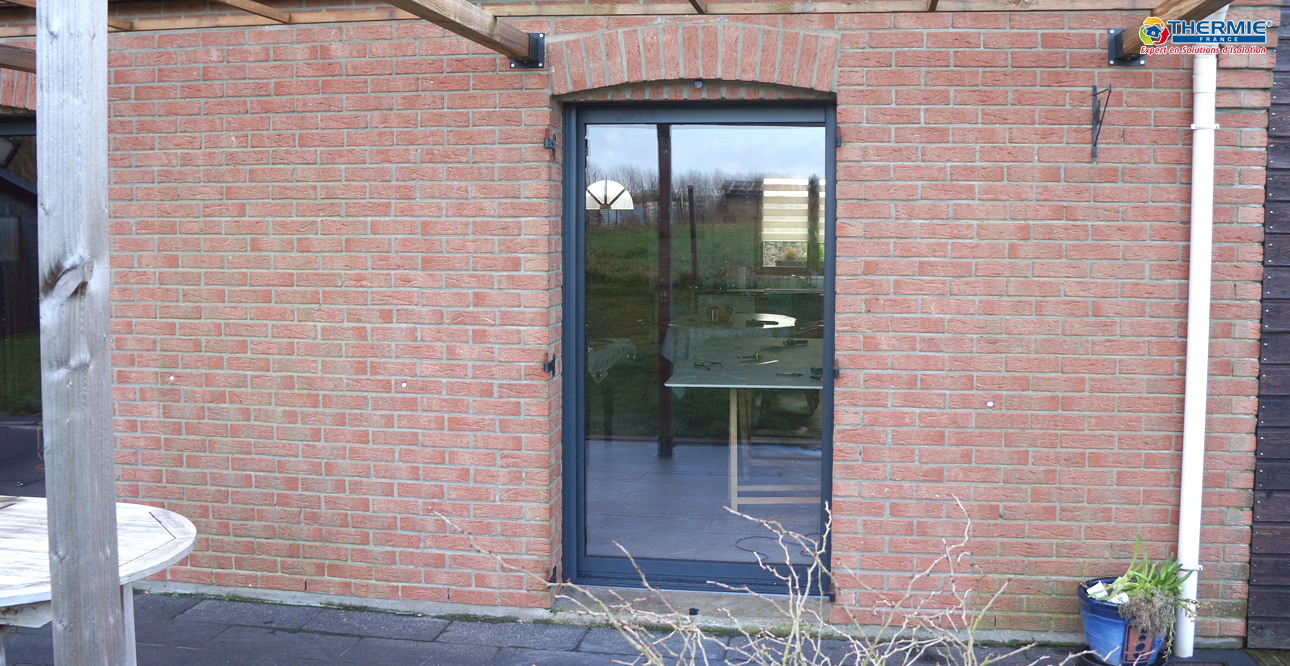 Yann a opté pour des baies coulissantes à galandage en aluminium K.Line. La couleur gris anthracite des fenêtres s’accorde parfaitement aux murs extérieurs de l’habitation.